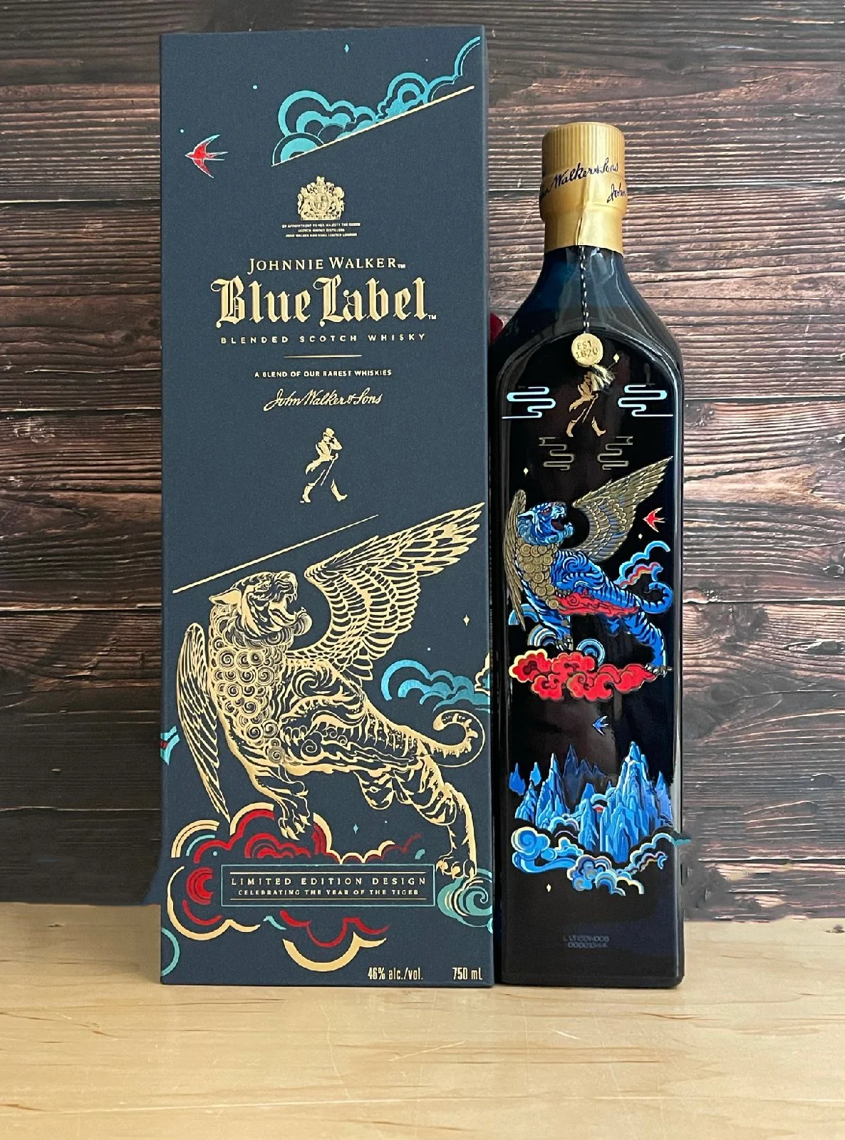 Celebrate the Lunar New Year in style with Johnnie Walker Blue Label 2022 limited edition release, crafted to honor the Year of the Tiger. This exquisite blended Scotch whisky is presented in a stunning bottle designed by acclaimed Chinese artist Shan Jiang, featuring intricate illustrations of a golden-winged tiger soaring above mountain clouds toward a modern metropolis. Symbolizing strength, progress, and prosperity, the design embodies the spirit of renewal and good fortune for the year ahead.